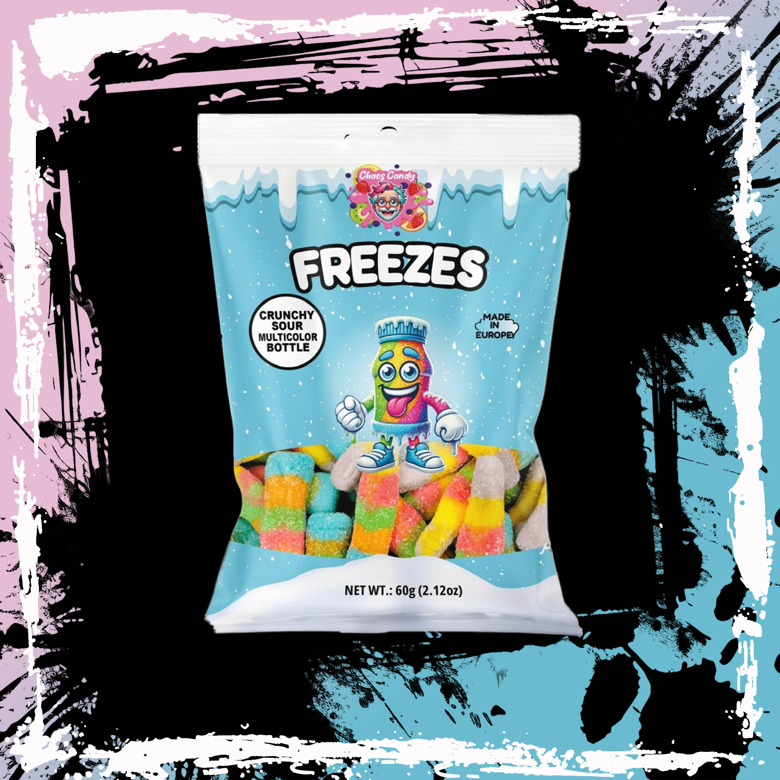 Die Chaos Candy Freezes Multicolor Bottles verbinden den Klassiker unter den Flaschen-Süßigkeiten mit dem unverwechselbaren Crunch der Gefriertrocknung. Durch den Entzug der Feuchtigkeit verwandelt sich das weiche Fruchtgummi in eine leichte, knusprige Textur – das bunte Design bleibt dabei vollständig erhalten.